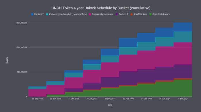 1INCH circulating supply ในช่วงเริ่มต้นจะเป็น 6% ของการออกทั้งหมดบวก 0.5% ในช่วงสองสัปดาห์แรกของ liquidity mining program โดย total supply ในปัจจุบันคือ 1.5 ล้าน 1INCH โทเค็น