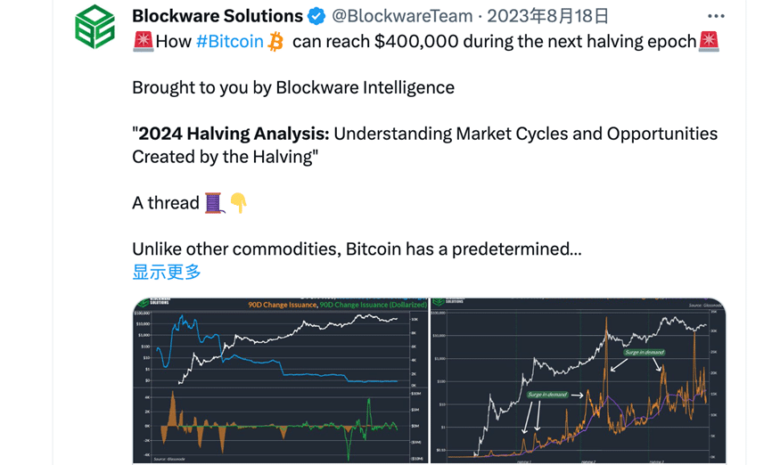 ในปีนี้ นักวิเคราะห์จาก Blockware Solutions กล่าวว่าการ Halving ในปี 2024 อาจผลักดันราคา Bitcoin ให้สูงถึง 400,000 ดอลลาร์สหรัฐ