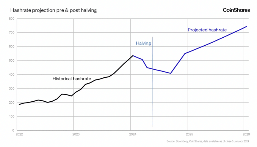 ตามรายงานของ CoinShares นับตั้งแต่การ Halving ของ Bitcoin ครั้งแรกในปี 2012 รวมถึงการ Halving ในปี 2016 และ 2020 โดยทั่วไปอัตรา Hash ของการขุดจะลดลงประมาณ 9% เมื่อเทียบกับเส้นแนวโน้มหลังจากเหตุการณ์การ Halving แต่ละครั้ง การลดลงนี้มักจะกินเวลาประมาณหกเดือน