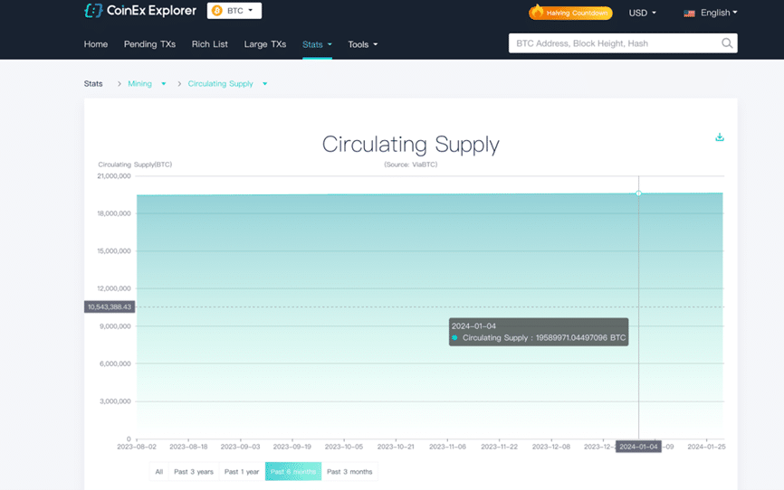 เราสามารถประมาณอัตราเงินเฟ้อรายปีได้หลังจาก Bitcoin halving จากรางวัลบล็อกเดี่ยวในปัจจุบันที่ 6.25 BTC การผลิตรายวันจะอยู่ที่ประมาณ 900 บล็อก ส่งผลให้มีการผลิตต่อปีที่ 900 * 365 ตามข้อมูลอย่างเป็นทางการจาก CoinEx Explorer ณ วันที่ 30 มกราคม ปริมาณการหมุนเวียนของ Bitcoin ทั้งหมดคือ 19,613,577 .