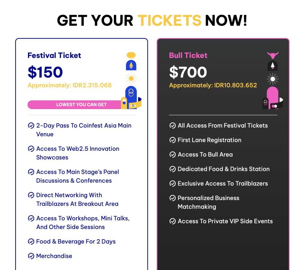 ใกล้เข้ามาเรื่อย ๆ แล้ว สำหรับงานอีเวนต์คริปโตฯ ที่มีโลเคชั่นที่สวยที่สุดแห่งหนึ่งของโลก! กับงาน Coinfest Asia 2023 ที่ปีนี้จัดขึ้นที่ Bali Clifftop ประเทศอินโดนีเซีย ระหว่างวันที่ 24-25 สิงหาคม 2566 นี้ ผู้ที่สนใจสามารถซื้อบัตรเข้างานแบบ 2-Day Pass ได้แล้ววันนี้ที่ Coinfest 2023 Ticket แล้วมาร่วมพูดคุยกับผู้นำจากโลก Web2.5 และเพลิดเพลินกับพระอาทิตย์ตกที่น่าทึ่งของบาหลีบนยอดหน้าผาจิมบารันไปด้วยกัน!!