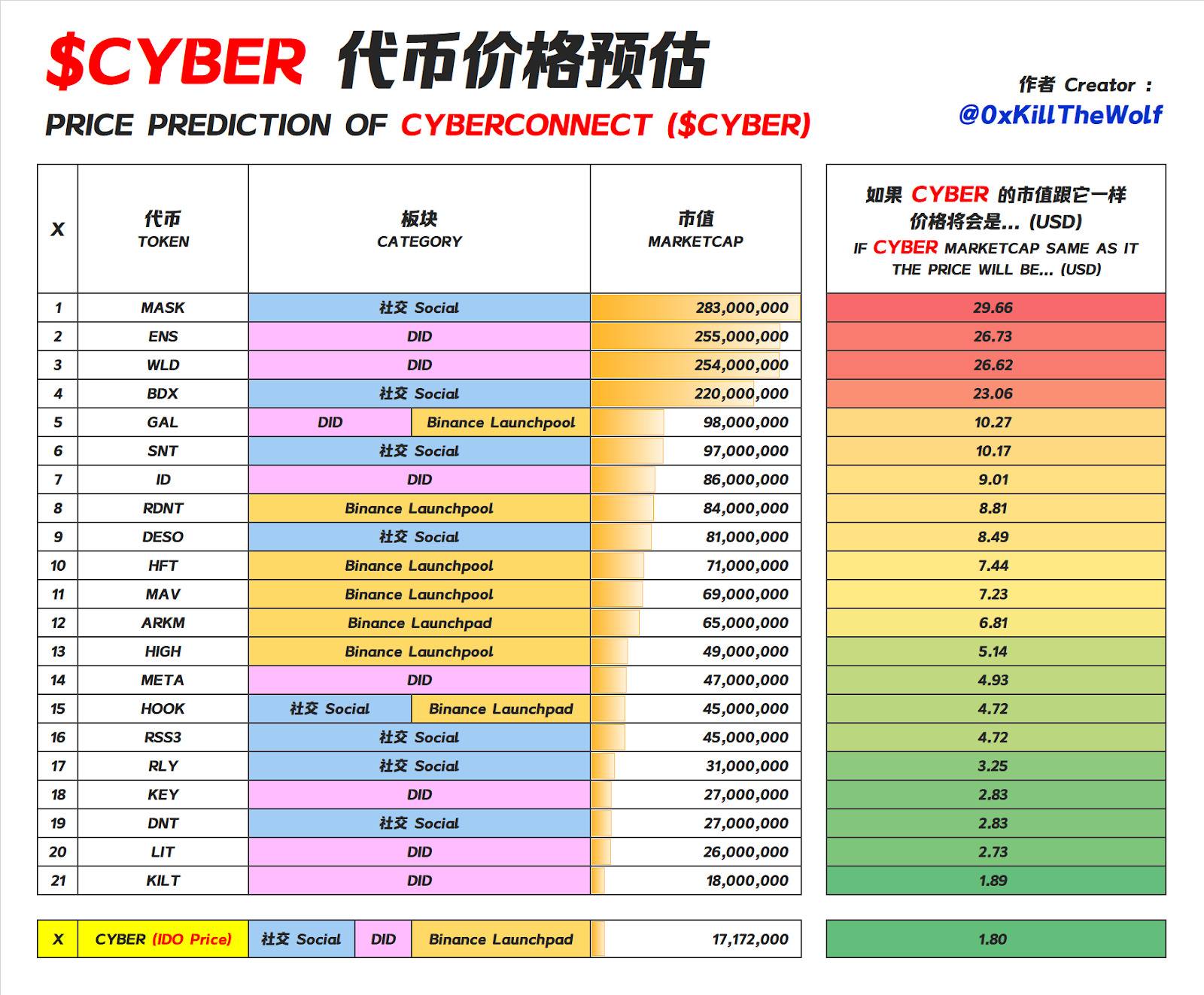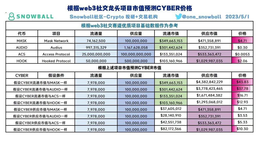 นี่คือตัวอย่างของ Moonsheet ที่ถูกสร้างขึ้นโดยผู้ใช้ Twitter ที่เปรียบเทียบมูลค่าตลาดของ CYBER กับ project ที่คล้ายๆกัน และจากนั้นก็ทำการคาดเดาราคา CYBER หลังจากการจำหน่ายครั้งแรก และ Token ที่เป็นที่นิยมและเปรียบเทียบได้ประกอบไปด้วย