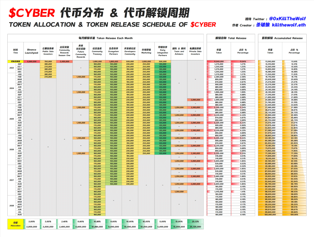 จำนวนจำกัดเริ่มต้นของ CYBER ที่ TGE คือ 11,038,000 (11.3% ของจำนวนรวมทั้งหมด) เปรียบเทียบกับ GAL ที่ 35,161,333 (17.5%) และ SEI ที่ 1,800,000,000 (18%) นอกจากนี้กฎการปลดล็อกสำหรับทีมและนักลงทุนมีดังนี้: