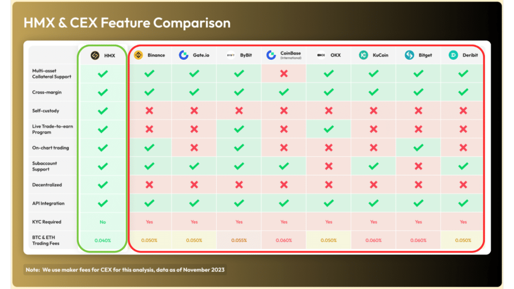 จากภาพจะเห็นได้ว่า HMX – แม้จะเป็น DEX – นั้นเต็มไปด้วย Features ต่างๆ ที่ทำให้ประสบการณ์การเทรดนั้นเหมือนกับ CEX ทั้งยังคงไว้ด้วยความเป็นส่วนตัว (ไม่ต้อง KYC) ความปลอดภัย และความไร้ศูนย์กลาง แถมทั้งค่าธรรมเนียมที่เทียบเท่ากับ CEX อีกด้วย