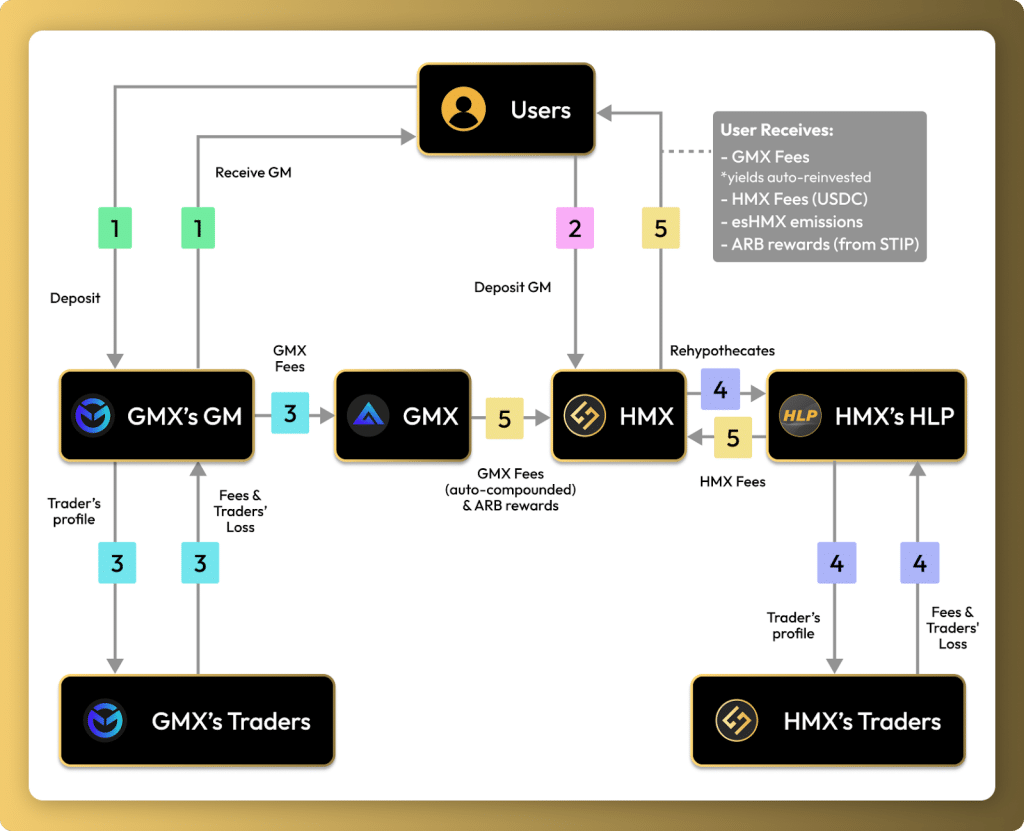 โดยคนที่สนใจจะรับ Yield ก็สามารถฝากสภาพคล่องเข้าไปที่ HLP Vault ของ HMX โดยสภาพคล่องก้อนนั้นก็จะได้รับ yield จากทั้งฝั่ง GMX และ HMX เป็นการ leverage สภาพคล่อง 1 ก้อนแต่ได้รับ yield ถึง 2 ทาง