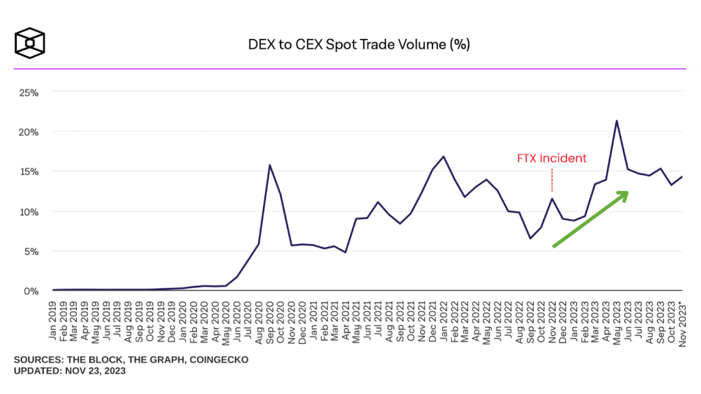 การล้มลงของ FTX เป็นสาเหตุหลักที่ผู้คนนั้นหันมาสนใจ On-chain Trading กันมากและส่งผลให้มี Platform DEX เพิ่มขึ้นมากมายในตลาด จากกราฟ DEX-to-CEX Spot Trade Volume จะเห็นเลยว่าหลังจากเหตุการณ์ FTX นั้น Volume การ Trade spot บน DEX เมื่อเทียบกันกับ CEX แล้วเพิ่มขึ้นอย่างเห็นได้ชัดนับเป็น 15% ของ spot volume บน CEX