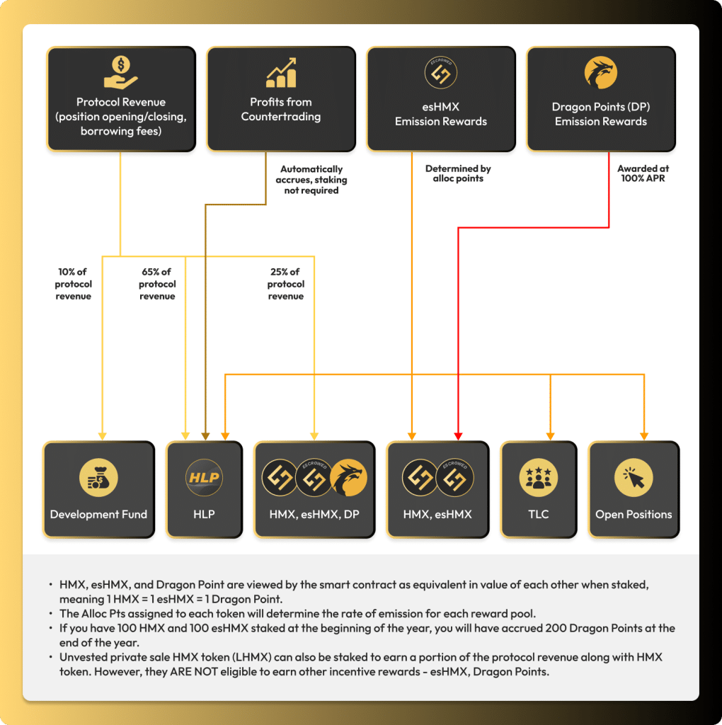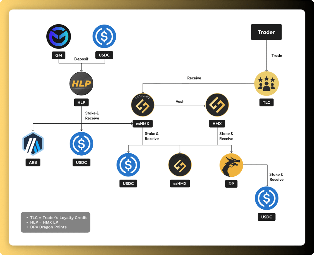 สำหรับการสร้าง Yield นั้น ผู้ถือเหรียญ HMX นั้นสามารถนำเหรียญไป Stake เพื่อที่จะได้รับ 25% ของค่าธรรมเนียมที่ HMX สร้างได้ และเพื่อเป็นการสนับสนุนการสร้าง real yield HMX ไม่เพียงแต่ให้ reward กับคนที่มาวาง LP เท่านั้นแต่ยังให้ reward กับ trader ผ่านระบบ loyalty ชื่อ Trader’s Loyalty Credits ($TLC) โดยการให้ reward กับ trader นั้นเป็นเหมือนการช่วยสนับสนุน (subsidize) ในการลดค่าธรรมเนียมการเทรดบน HMX ให้กับนักเทรดเหล่านั้น และเป็นการลด barrier-to-entry ให้กับเทรดเดอร์ใหม่ ๆ เพื่อจะช่วยกระตุ้นให้คนมาใช้งานมากขึ้น