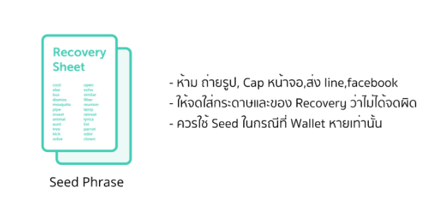 โดยทั่วไปแล้วในบาง Wallet จะสามารถ Export Private Key ออกมาดูได้ แต่อย่างไรก็ตามนั่นก็ไม่ใช่สิ่งที่คุณควรจะทำ เพราะ private key ต่างๆสามารถเข้าถึงได้ด้วย seed ได้อยู่แล้ว โดยหลังจากที่คุณได้ Seed word มาแล้ว สิ่งสำคัญที่สุดคือให้คุณจด Seed word เหล่านั้นใส่กระดาษเท่านั้น “ห้ามถ่ายรูป, ห้ามแคปหน้าจอ, ห้ามพิมพ์ลงใน Notepad, google drive, line, facebook หรือทำให้มันอยู่ในรูปแบบดิจิทัลเด็ดขาด” มีกรณีมากมายของคนที่ถูก Hack จากความมักง่ายโดยเก็บ Seed ในรูปแบบดิจิทัล และหลังจากคุณจด Seed แล้วคุณควรลองเอา Seed มาลอง Recover ดูซักครั้งหนึ่งเพื่อให้มั่นใจว่าคุณไม่ได้จด Seed ผิดไม่เช่นนั้นเมื่อถึงคราวที่คุณต้องการใช้มัน คุณอาจจะไม่สามารถกู้เงินของคุณก็เป็นได้
