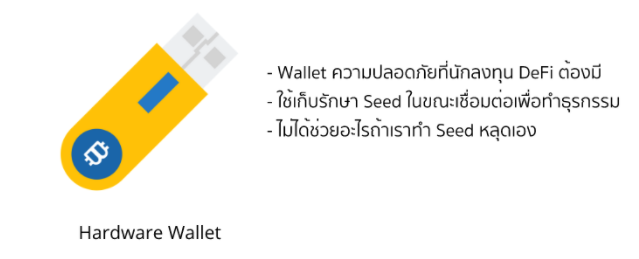 การใช้ Hardware Wallet เป็นสิ่งที่ใครที่คิดอยากเป็นนักลงทุน DeFi หรือคนที่ต้องการความปลอดภัยสูงควรหามาใช้ ข้อดีของ Hardware wallet คือเป็นอุปกรณ์ที่ถูกสร้างขึ้นมาเพื่อปกป้อง Private Key ของคุณใน Hardware Wallet จาก Malware หรือไวรัสคอมต่างๆ ในขณะที่คุณใช้งาน รวมถึงตอนที่คุณสร้างกระเป๋า Wallet ขึ้นมาครั้งแรก รหัสคำ Seed word นี้จะปรากฎอยู่บนตัวอุปกรณ์ Hardware Wallet เท่านั้น เพื่อให้คุณทำการจดเก็บใส่กระดาษได้ ทำให้คุณวางใจได้ว่าจะไม่โดนขโมย Seed ไปแน่นอน