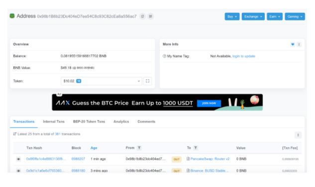 Block Explorer เป็นเว็บที่เอาไว้ดูบัญชีและธุรกรรมการโอนเงินที่เกิดขึ้นใน Blockchain คุณสามารถดู transaction หรือ address ไหนของใครก็ได้ และสามารถดูได้แม้กระทั่งรายละเอียดว่า transaction นี้คุณทำอะไร Block Explorer (ฺBscscan สำหรับ Binance Smart Chain หรือ Etherscan สำหรับ Ethereum Chain) เป็นตัวช่วยของคุณในหลายสถานการณ์ เช่น