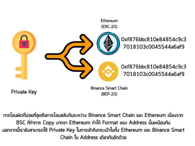 Note: ในกรณที่เราใช้ Wallet ของตัวเอง Private Key ตัวเดียวกันจะสามารถเข้าถึงเลขกระเป๋าเดียวกับบน BSC และ Ethereum ได้ เพราะงั้นถ้าเราโอนผิดบน Wallet ของเราเองที่เรามี Private Key การกู้คืนจะง่ายกว่าการโอนผิดบนเว็บเทรด Exchange มาก