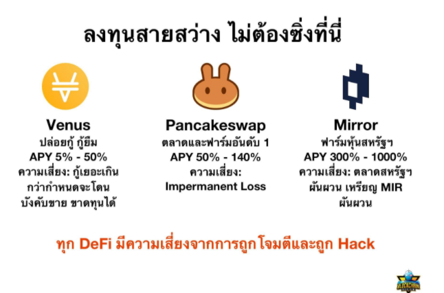 - ลงทุนแต่ใน DeFi กระแสหลัก เช่น Uniswap, Pancakeswap, Venus, Compound, Mirror เป็นต้น
