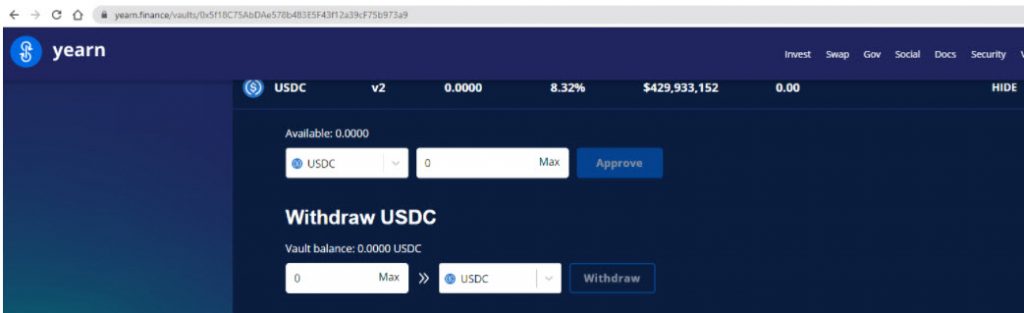 ขั้นตอนแรกเรานำ USDC มาฝากไว้ใน Yearn.finance ที่ให้ผลตอบแทน 8.32% APY จากนั้น Yearn จะให้ YvUSDC เป็นสัญญาในการฝาก