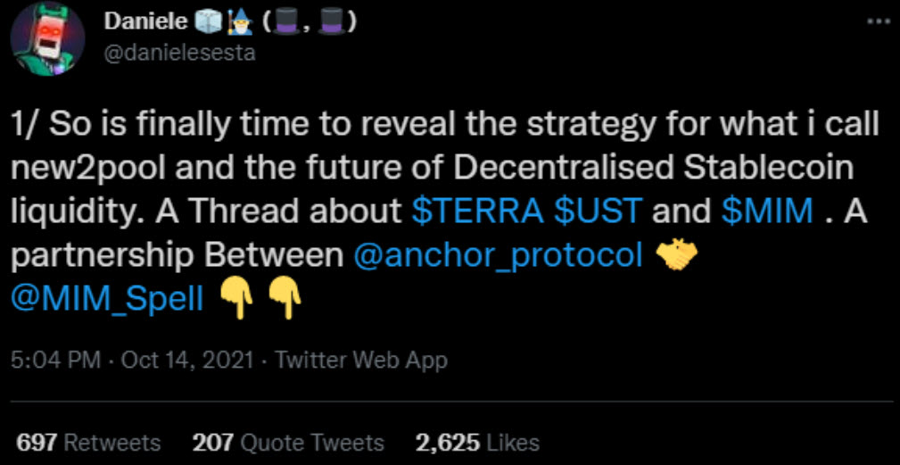 Terra: เมื่อวันที่ 14 ตุลาคม 2564 Daniele ได้ประกาศใน Twitter ถึงความร่วมกับ Terra ว่าสามารถนำ $UST ที่เป็น Algorithmic Stablecoin บน Terra Chain มาค้ำประกันได้แล้วเช่นกันซึ่งจะกู้ได้สูงสุดที่ 90% เช่นเดียวกับ Stablecoin LP ตัวอื่นๆ โดยเบื้องหลังการทำงานหลังจากเราฝาก $UST แล้วจะ Bridge ไปฝากที่ Anchor บน Terra Chain เพื่อรับดอกเบี้ย 20% ต่อปี ถือว่าเป็นสินทรัพย์ที่มีดอกเบี้ยติดตัวเช่นเดียวกัน