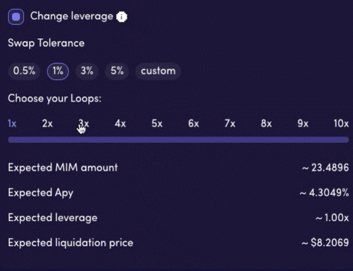 ซึ่งทาง Abracadabra ก็อำนวยความสะดวกให้โดยการเพิ่มปุ่ม Change Leverage ให้ โดยสิ่งที่ต้องคำนึงถึงคือจะกู้ $MIM กี่เปอเซนของยอดค้ำประกัน และจำนวนครั้งที่ต้องการหมุนเงินจากปุ่ม Choose your Loops ยิ่งกู้ $MIM เยอะหรือหมุนเงินหลายรอบก็จะมีความเสี่ยงมากขึ้น โดยเรา Leverage ได้สูงสุดถึง 6.51 เท่า