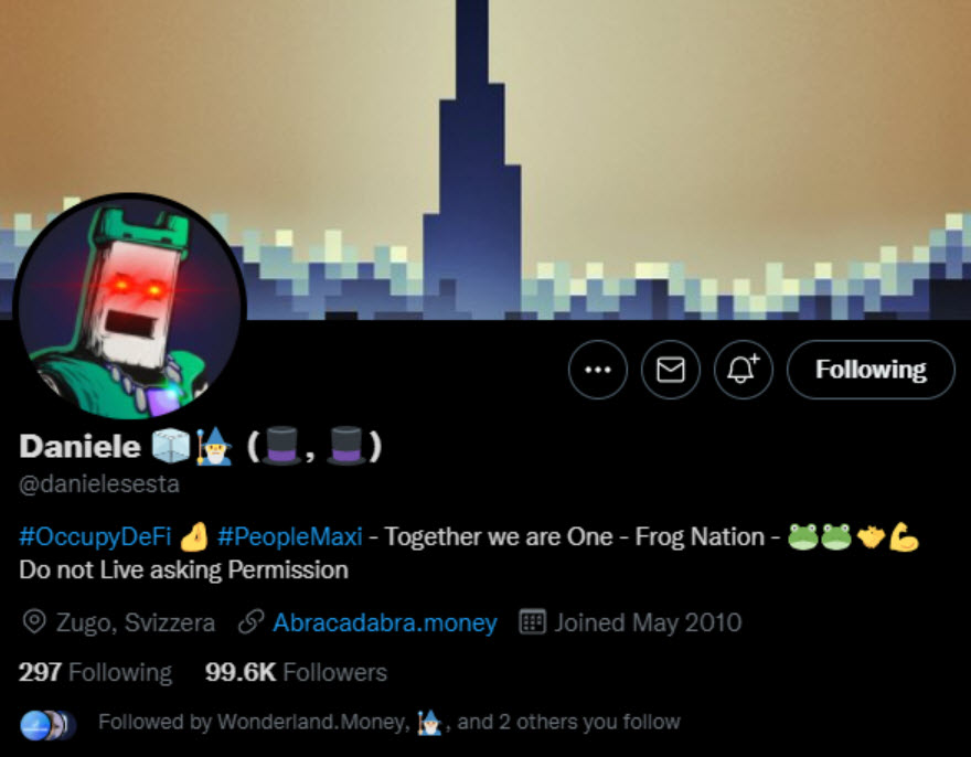 - Team หนึ่งใน Developer ของ Abracadabra คือ Daniele Sesta หรือ @danielesesta ผู้อยู่เบื้องหลังแพลตฟอร์มที่มีชื่อเสียง เช่น Popsicle Finance (เคยโดนแฮค ลิงค์ข่าว) ที่เป็น multichain yield optimization platform และ Wonderland ที่เป็น decentralized reserve currency protocol บน Avalanche คล้ายกับ OlympusDao บน Ethereum เรียกได้ว่าเป็น Developer ที่มีอิทธิพลในวงการ DeFi อย่างมาก