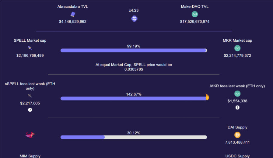 เปรียบเทียบ $MIM และ $DAI: จากข้อมูลของ ByeByeDai ซึ่งเป็นเว็บเปรียบเทียบ Abracadabra กับ MakerDao ชี้ให้เห็นชัดเลยว่าประสิทธิภาพของ Abracadabra นั้นดีกว่า MakerDao หลายเท่าเพราะ TVL ของ Abracadabra เล็กกว่า MakerDao ถึง 4.23 เท่า แต่ค่าธรรมเนียมที่แพลตฟอร์มได้รับนั้นสูงกว่าถึง 1.42 เท่า และเมื่อเทียบ $MIM Supply แล้วยังเป็นเพียง 30% ของ $DAI Supply จึงตีความได้ว่า Abracadabra ยังมีพื้นที่เติบโตได้อีกมาก แต่อย่างไรก็ตาม $MIM ยังไม่ได้มีการยอมรับ การใช้อย่างแพร่หลาย และผ่านวิกฤตช่วงตลาดตกหนักเท่ากับ $DAI เพราะฉะนั้นการใช้ $MIM ก็ยังมีความเสี่ยงมากกว่าซึ่งก็ต้องใช้เวลาเป็นเครื่องพิสูจน์
