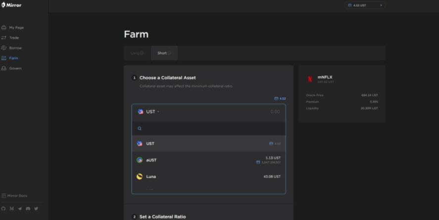 จึงเกิดการฟาร์มรูปแบบใหม่ที่ความเสี่ยงน้อยมากใกล้เคียงกับการฝาก Anchor แต่ได้ APR สูงกว่าเรียกว่า Delta Neutral โดยทำบน Mirror Finance ซึ่งเป็นการเก็งหุ้นขึ้นและลงพร้อมๆกัน ทำให้เราไม่มีความเสี่ยงเรื่องราคาขึ้นลง และยังได้รับผลตอบแทนจากการ Long Farm และ Short Farm อีกด้วย ข้อเสียคือการปิด Short Farm จะต้องเสียค่าธรรมเนียม 1.5% เพราะฉะนั้นจึงควรนั่งแช่นานๆและไม่ควรเปิดปิดบ่อยๆ