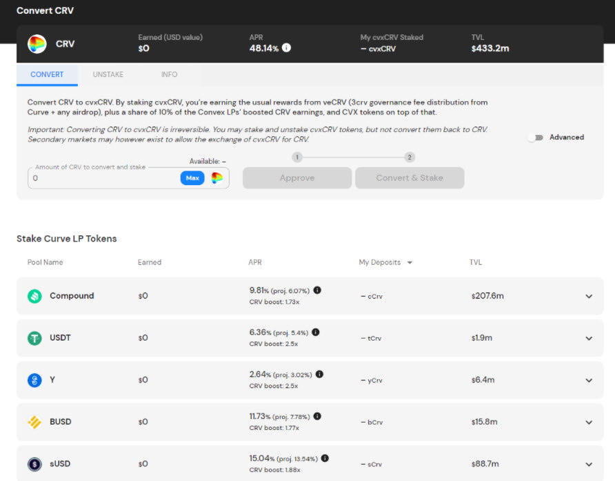 - ฝาก CRV กับ Convex จะได้ค่า Fee และสิทธิประโยชน์ต่างๆเท่ากัน และเหนือกว่าเพราะจะให้ Fee ของ Convex เพิ่มด้วย โดยการฝาก CRV ที่นี่จะได้รับ cvxCRV และไม่สามารถแปลงกลับเป็น CRV นอกจากนี้สามารถนำ cvxCRV ไปค้ำแล้วกู้ MIM ใน Abracadabra ต่อได้เช่นกัน