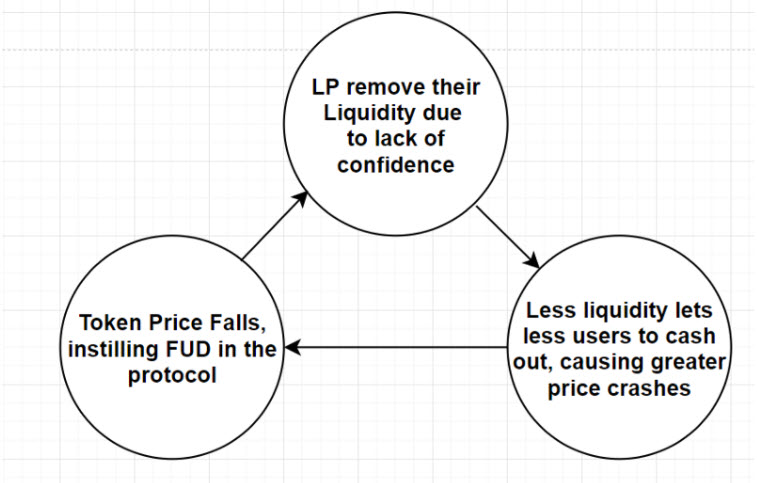 จนถึงจุดหนึ่งที่ราคาตกหนักจน APR จากการฟาร์มไม่คุ้ม เค้าก็จะถอน Liquidity ออกแล้วย้ายไปฟาร์มที่อื่น กลายเป็นว่าแพลตฟอร์มก็ดึงดูด Liquidity ระยะยาวไว้ไม่ได้