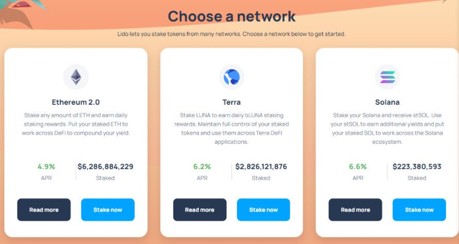ปัจจุบัน Lido ไม่ได้เปิดรับในการเป็น Validator Node ของ Ethereum เท่านั้น ตอนนี้สามารถฝาก LUNA เพื่อเป็น Terra Validator และ SOL เพื่อเป็น Solana Validator ได้แล้ว