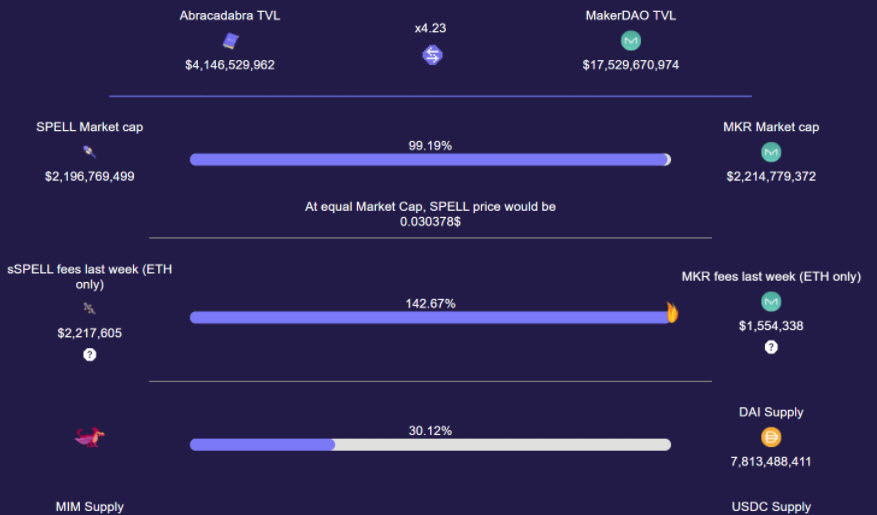 จากข้อมูลของ ByeByeDai ซึ่งเป็นเว็บเปรียบเทียบ Abracadabra กับ MakerDao แพลตฟอร์ม DeFi 1.0 ที่เปิดให้วางสินทรัพย์เพื่อกู้ DAI Stablecoin ชี้ให้เห็นชัดเลยว่าประสิทธิภาพของ Abracadabra นั้นดีกว่า MakerDao หลายเท่าเนื่องจาก TVL ของ Abracadabra เล็กกว่า MakerDao ถึง 4.23 เท่า แต่ค่าธรรมเนียมที่แพลตฟอร์มได้รับนั้นสูงกว่าถึง 1.42 เท่า และเมื่อเทียบ $MIM Supply แล้วยังเป็นเพียง 30% ของ $DAI Supply จึงตีความได้ว่า Abracadabra ยังมีพื้นที่เติบโตได้อีกมาก และหากว่า MIM ได้รับการยอมรับเทียบเท่ากับ DAI จนมีการใช้อย่างแพร่หลาย และได้ทดสอบผ่านวิกฤตช่วงตลาดตกหนักเท่ากับ DAI แล้วรอดมาได้ Abracadabra ก็น่าจะเป็นอีกแพลตฟอร์มที่น่าจับตาเมหือนกัน