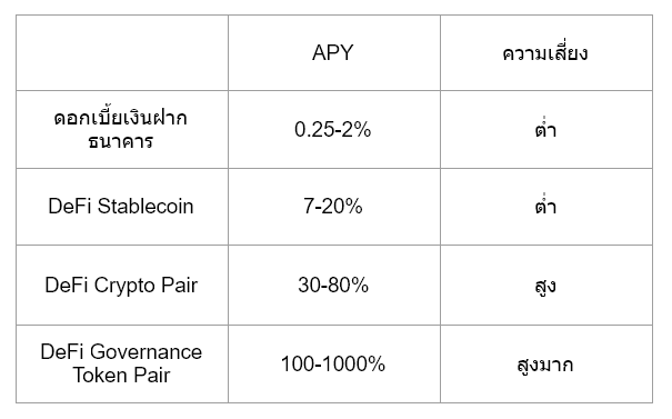 การลงทุนใน DeFi นั้นไม่ใช่การที่คุณเอาเงินไปซื้อเหรียญอะไรเหรียญหนึ่งแล้วรอโอกาสทำกำไรตอนที่เหรียญมันขึ้น แต่มันจะคล้ายกับการที่คุณเอาเงินไปวางแล้วได้ดอกเบี้ย เช่น การที่คุณปล่อยกู้เงินใน Compound คุณก็จะได้ค่าธรรมเนียมจากการที่มีคนกู้เงินนั้นไป ถ้าคุณนำเงินไปวางเป็นคู่เทรดใน Uniswap คุณก็จะได้ผลตอบแทนตามสัดส่วน เมื่อมีคนแลกเปลี่ยนเหรียญในคู่เทรดที่คุณวางไว้ จากค่าธรรมเนียมที่เกิดขึ้นในระบบให้แก่คุณ ซึ่งรายได้ของคุณนั้นก็จะไม่คงที่เพราะมันจะแปรผันไปตามการใช้งานที่เกิดขึ้นจริงแต่ก็แน่นอนว่าเมื่อคิดเฉลี่ยต่อปีแล้วมันสูงกว่าการฝากเงินธนาคารมาก (แล้วเราจะฝากเงินธนาคารไปทำไม?)