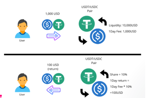 ผลตอบแทนจะขึ้นกับค่าธรรมเนียมและสัดส่วนของเงินที่เราใส่ลงไป เช่นถ้า Pool USDT/USDC มีเงินอยู่ 10,000 USD แล้วเรามีเงินอยู่ในนั้น 1000 USD (500 USDT/500 USDC) ถ้า Pool นี้ได้รับค่าธรรมเนียม 1000 USD ต่อวันเท่ากับว่าคุณจะได้รับผลตอบแทน 1000/10000 * 1000 = 100 USD โดยผลตอบแทนนั้นจะถูกเพิ่มลงไปใน Pool แบบทบต้นต่อวันในรูปแบบ USDT/USDC ซึ่งคุณจะได้รับมันเมื่อคุณทำการถอนเงินออกจาก Pool