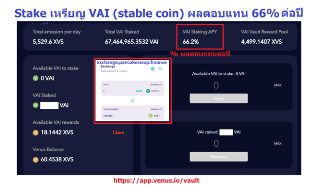 - ไปที่ app.venus.io/vault เลือก Stake เหรียญ Vai