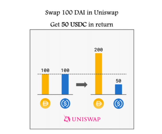 ตัวอย่างเช่นถ้าเราต้องการซื้อ 100 USDC ใน pool uniswap ด้วย 100 Dai ที่มี 100 USDC:100 Dai มันจะกลายเป็นว่าเราจะได้เหรียญ USDC มาแค่ 50 USDC ที่เกิดจาก Price Impact เพราะอย่างนั้นมันในทางเทคนิคแล้วเราจะไม่สามารถทำการซื้อเหรียญในข้างใดข้างหนึ่งจนหมด Pool ได้ และมันเป็นกระบวนการที่สามารถพยุงราคาเหรียญได้