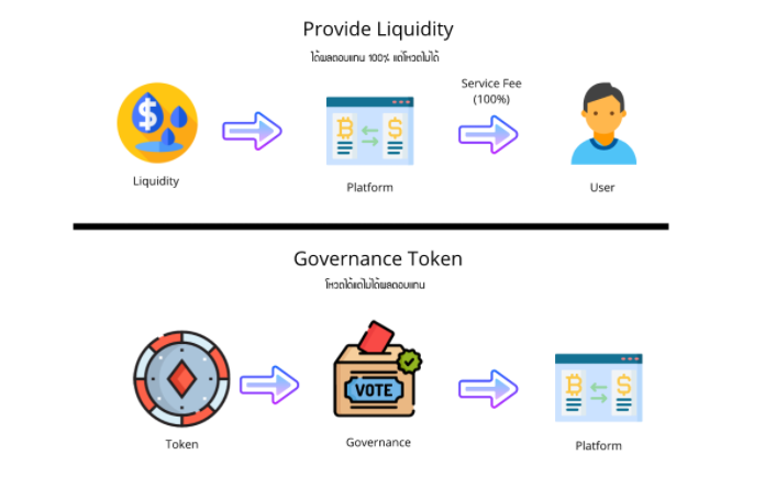 ถ้าอธิบายให้ง่ายที่สุดแล้ว Governance Token นั้นคือ “หุ้นที่ไม่มีการปันผล” เพราะการถือเหรียญ Governance Token นี้โดยส่วนมากแล้วคุณจะไม่ได้ผลตอบแทนใดๆจากแพลตฟอร์ม (เว้นแต่ฝากเป็นคู่เหรียญหรือเอาไป Stake) เนื่องจากผลตอบแทนทั้งหมดจากค่าธรรมเนียมนั้นถูกจ่ายให้แก่ผู้ที่ฝากเป็นสภาพคล่องหมดแล้ว แต่ส่วนที่ทดแทนกันคือมันสามารถนำมาใช้ในการโหวตได้