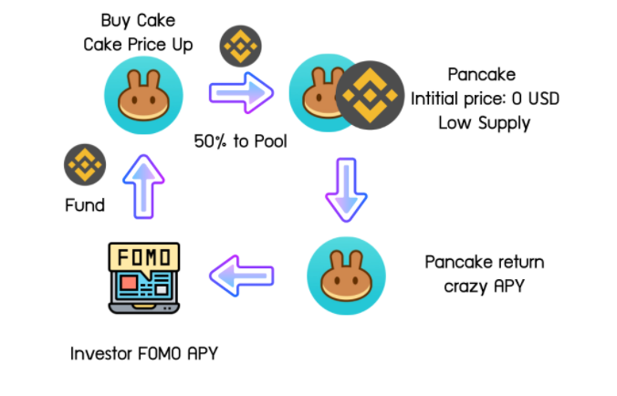 เพราะฉะนั้นมันจึงจะเกิดสิ่งที่เรียกว่า “แชร์” หรือการหมุนเงินในรูปแบบหนึ่ง เราจะเห็นว่าด้วยเงินจำนวน น้อยนิดเราสามารถสร้างตัวเลข APY ที่เป็นผลตอบแทนจำนวนมหาศาลได้ทำให้มีคนยอมซื้อเหรียญ Governace Token เพื่อเก็งกำไรหรือแม้แต่เพิ่มเป็น Liquidity เพื่อการซื้อขายเหรียญใน Pool นั้น ซึ่งเราจะเห็นว่ามันง่ายมากที่จะดันราคาเหรียญในช่วงแรกๆจากการที่ Liquidity มันน้อยมากๆ การซื้อเหรียญเพียงน้อยนิดก็เพียงพอแล้วต่อการดันราคาเหรียญ