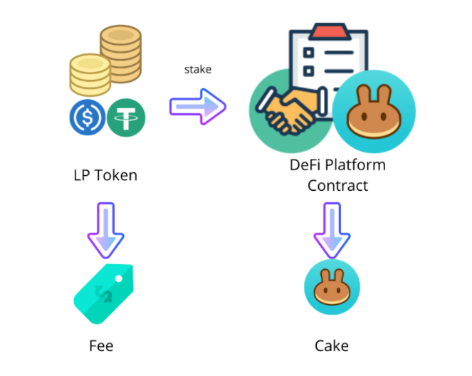 - แพลตฟอร์ม Swapping ของ Uniswap หรือ PancakeSwap ที่นำค่าธรรมเนียมของผู้ที่มาแลกเปลี่ยนคู่เหรียญมาจ่ายให้คนที่ฝากเหรียญในระบบ
