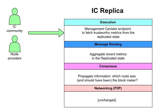 ในทางกลับกัน MR layer จะเพิ่มข้อมูลนี้ลงในสถานะที่ replicated state ซึ่งจะมีการลงนามตามเกณฑ์โดยโหนดใน subnet เพื่อให้แน่ใจว่าโหนดที่สุจริตทั้งหมดมีสถานะเดียวกัน โดยเมทริกซ์สำหรับจำนวนบล็อกที่เสนอทั้งสำเร็จและล้มเหลวจะถูกสะสมใน replicated state สำหรับโหนดที่เป็นของ subnet