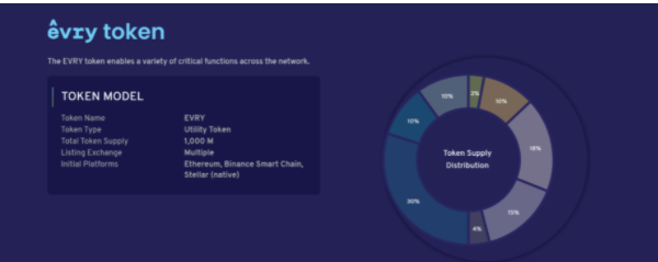 โทเคน EVRY มีจำนวนทั้งหมด 1,000 ล้านโทเคน โดยโทเคนดั้งเดิมจะอยู่บนเชนของ Stellar และสามารถใช้งานได้บนเชน Ethereum, Binance Smart Chain และเชนอื่นๆในอนาคต