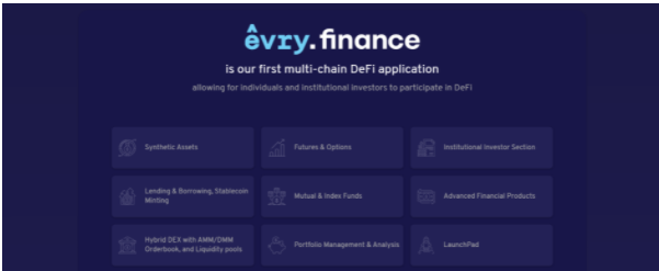 DApp ตัวนี้เป็นผลิตภัณฑ์หลักที่มาพร้อมรายการผลิตภัณฑ์และบริการทางการเงินที่ครอบคลุม เช่นผู้ใช้งานสามารถใช้เพื่อดูและวิเคราะห์ Portfolio ของตนได้ รวมถึงเป็น Decentralized Exchange (ตลาดการซื้อขายที่ไร้ตัวกลาง), แหล่งรวมสภาพคล่อง, การให้บริการกู้ยืม, กองทุนรวม,สินทรัพย์สังเคราะห์, ตลาด NFT, มีส่วนเฉพาะสำหรับนักลงทุนสถาบัน(ด้วยผลิตภัณฑ์ทางการเงินที่มีสภาพคล่องสูง) และผลิตภัณฑ์ทางการเงินอื่น ๆ โดยในอนาคตตัว Evry.Finance จะพัฒนาไปเป็น Institutional high-speed multi-chain dex ที่สามารถ process มากกว่า 100,000 transactions ต่อวินาที