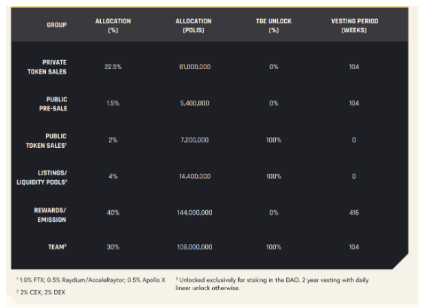 Polis จะเป็น Governance Token ที่ออกแบบให้เป็น Store of value โดยทำหน้าที่ควบคุมแพลทฟอร์มในการสร้างเหรียญ Atlas โดย Supply นั้นจะมี 360,000,000 Polis โดยจะสามารถซื้อขายในตลาดรองหรือได้จากการทำ Missioin ในเกม โดยจะเปิด IEO ขายใน FTX และ Raydium