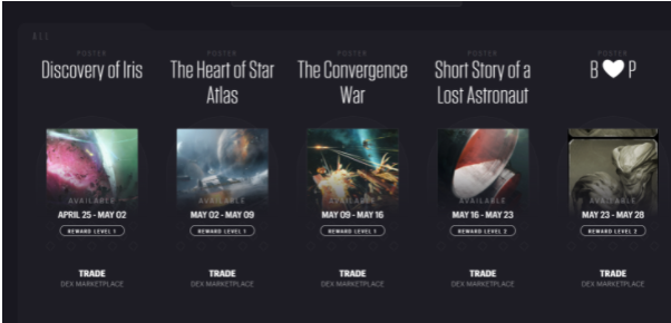 ในตอนนี้ถ้าเรากด Play game ส่วนที่เราจะสามารถเข้าไปดูได้คือส่วนของ Market Place ที่มีการซื้อขายโปสเตอร์กันอยู่ ซึ่งโปสเตอร์ที่เป็น NFT นี้ก็ไม่ใช่ธรรมดาเพราะมีการ Collaboration เช่น โปสเตอร์ Armstrong Forever ซึ่งเป็นการร่วมมือกับ US Space Force หรือโปสเตอร์ ReBirth ที่ร่วมมือกับ Blond:ish ที่มีชื่อเสียงในวงการเพลงเทคโน