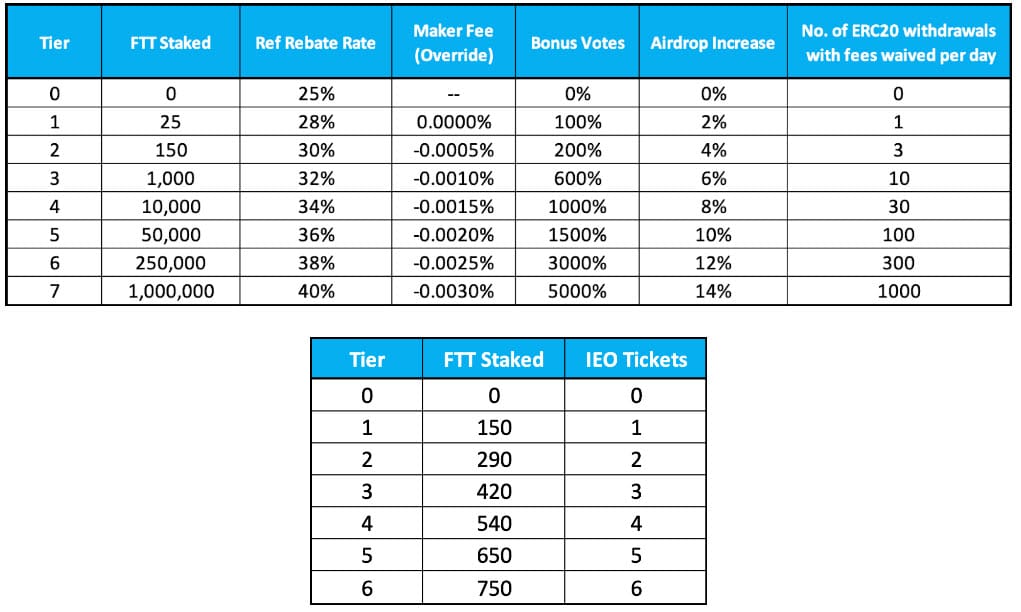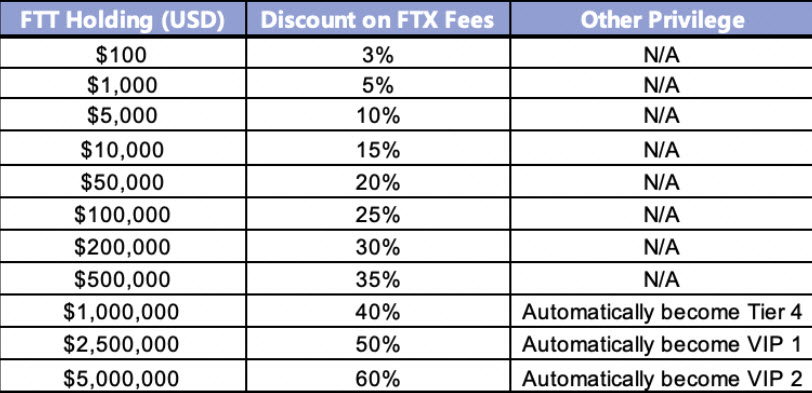 1) ส่วนลดค่าธรรมเนียมในการเทรดสูงสุดถึง 60% หากนำเหรียญ FTT ไป Stake ในสัดส่วนต่างๆตามตารางด้านล่าง
