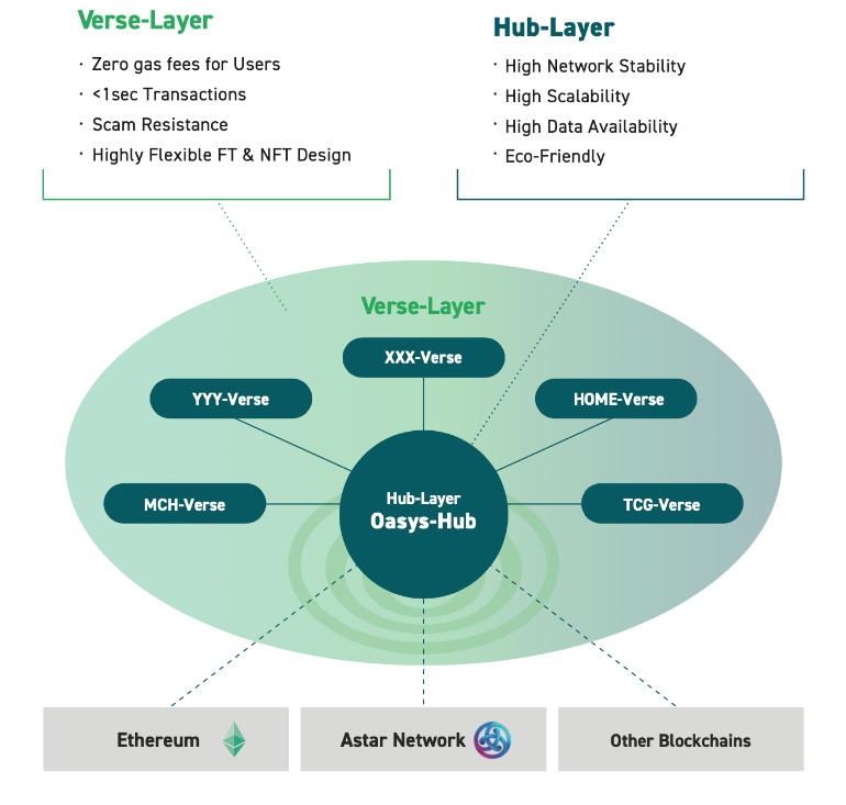 Verse-layer: เป็น Blockchain Layer 2 ของ Oasys Ecosystem โดยใช้เทคโนโลยี Optimistic rollups เพื่อรวบรวมข้อมูลธุรกรรมไปบันทึกบน Hub-layer อีกทีหนึ่ง ความแตกต่างคือ Oasys จะทำการบันทึกธุรกรรมลงบน Hub-layer ทันทีโดยไม่ต้องรอ 7 วันเหมือนกับ Optimistic Rollups ทำให้ความเร็วการทำธุรกรรม Oasys นั้นเหนือกว่า Blockchain และ Layer 2 Solution อื่นๆ โดยทำให้เกมที่สร้างบน Oasys นั้นมีความเร็วเทียบเท่ากับเกมที่เราคุ้นเคยกันบน Web2 ได้เลย