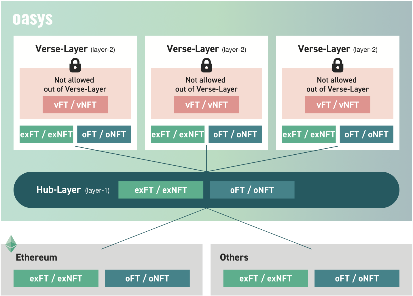 - exFT/exNFT: สร้างบนเชนอื่นนอก Oasys และสามารถนำเข้ามาใช้งานภายใน Ecosystem ผ่าน Cross-chain Bridge