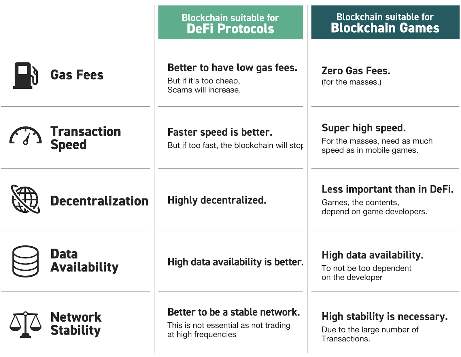 ก่อนที่จะไปทำความรู้จักกับ Oasys Blockchain กันให้มากขึ้น เรามาทำความเข้าใจกันเบื้องต้นก่อนว่าทำไมถึงต้องมี Blockchain เฉพาะสำหรับเกม โดยมาดูกันว่า Blockchain สำหรับ DeFi และ Games นั้นมีจุดสำคัญต่างกันอย่างไรบ้าง