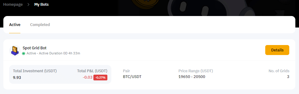 หลังจากคลิก Create Now แล้ว หน้าจะเปลี่ยนเส้นทางไปยัง My Bots โดยอัตโนมัติเพื่อให้คุณดู Grid Bot ที่กำลังใช้งานอยู่ได้ และคุณสามารถคลิก Detail ที่มุมขวาบนของแต่ละ Grid Bot เพื่อดูข้อมูลเพิ่มเติมได้