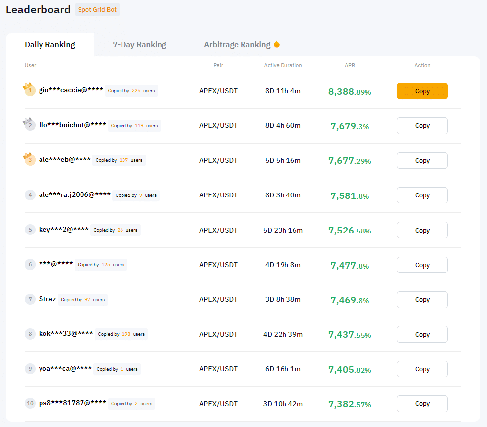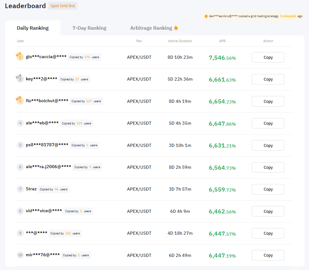 และที่สำคัญคือ Bybit มีฟังก์ชันการ Copy Trade สำหรับ Grid Trading ด้วย ทางระบบจะจัดอันดับคนที่วางกลยุทธ์แล้วได้กำไรสูงสุดตาม Daily Ranking และ 7-Day Ranking โดยคิดเป็น Total Annual Percentage Rate (APR)