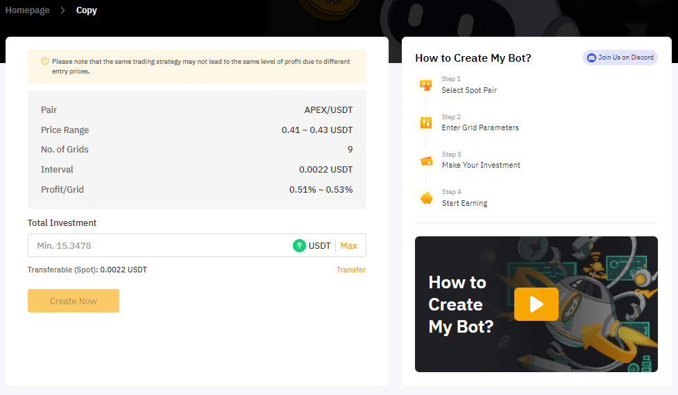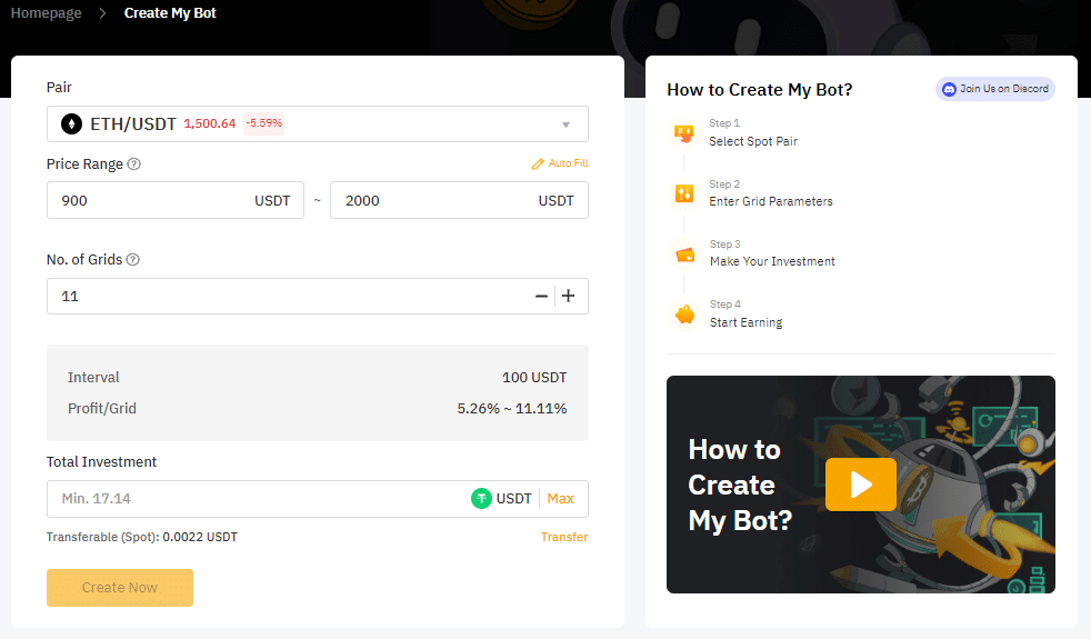 ทางระบบจะแสดง Pair, Price Range, No. of Grids, Interval, Profit/Grid ไว้ให้ครบเลย ผู้ใช้งานเพียงแค่ใส่เงินลงทุนไปเท่านั้น แล้วจากนั้นก็คลิก Create Now ก็เป็นอันเสร็จเรียบร้อย