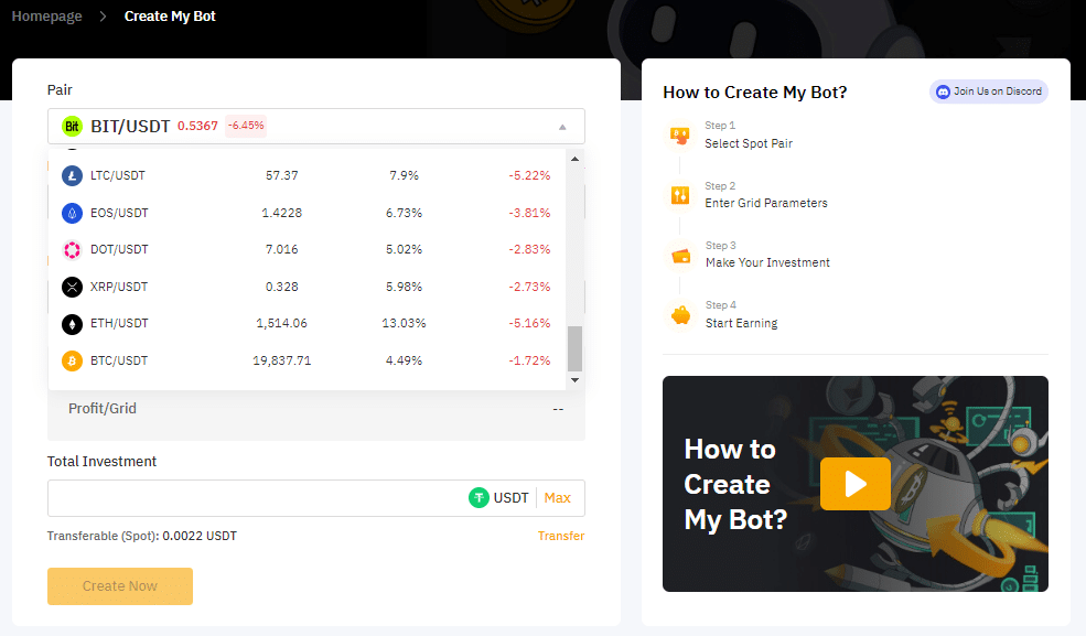 ในตอนนี้ Bybit มีเหรียญที่รองรับทั้งหมด 28 เหรียญสำหรับ Grid Bot เช่น BIT/USDT, BTC/USDT, ETH/USDT, XRP/USDT, MANA/USDT, SOL/USDT, MATIC/USDT, ADA/USDT, LINK/USDT และ DOT/USDT เป็นต้น