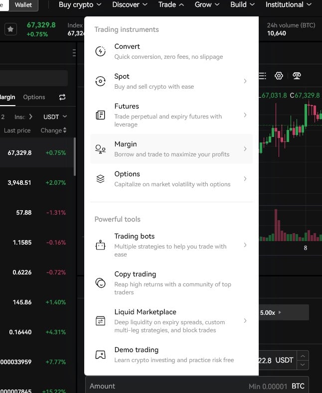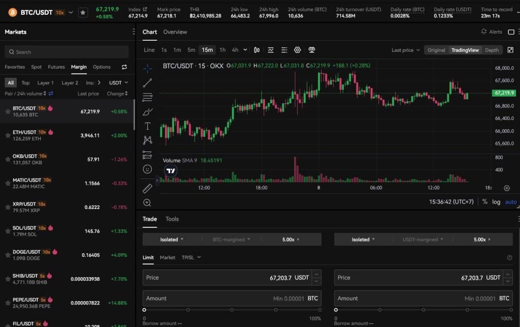 ในปัจจุบันการซื้อขายบน OKX นั้นรองรับทั้ง spot, margin , future ซึ่งผู้ใช้งานมีตัวเลือกในการเทรดมากมายอย่างอิสระตามที่ต้องการ โดยเลือกได้จากเมนู Trade ด้านบน