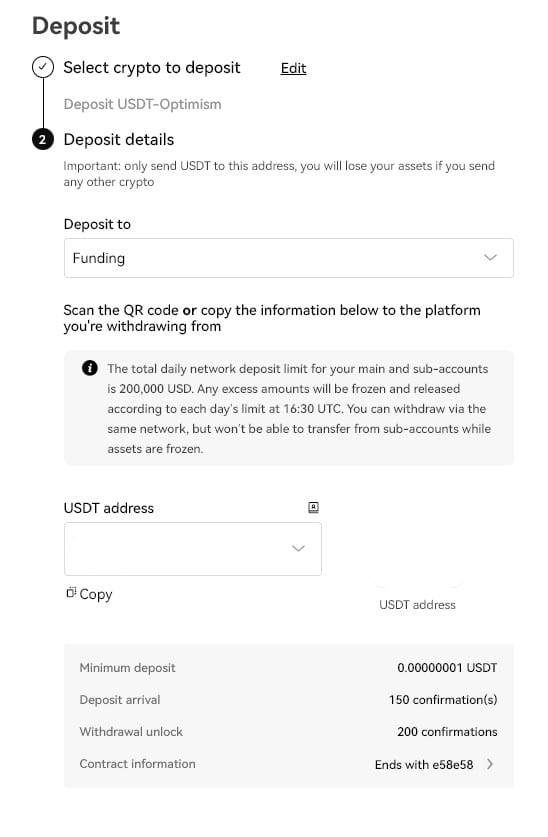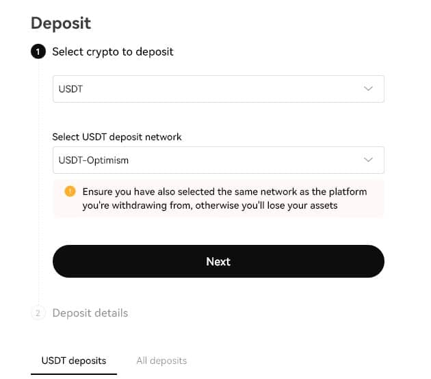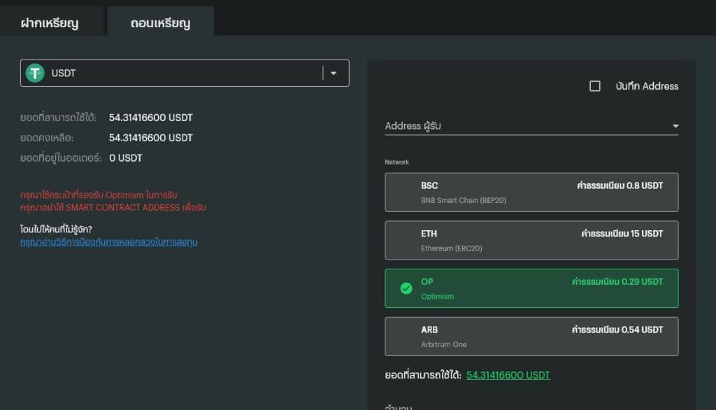จากนั้นในช่อง “Select crypto to deposit”ให้เลือก USDT จากนั้นในช่อง “Select USDT deposit network”ให้เลือกเครือข่ายที่ต้องการใช้สำหรับการฝาก โดยในตัวอย่างนี้จะเลือกใช้ Optimism (OP) (ค่าธรรมเนียมต่ำสุด) จากนั้นกด Next และกด Copy Address ได้เลย
