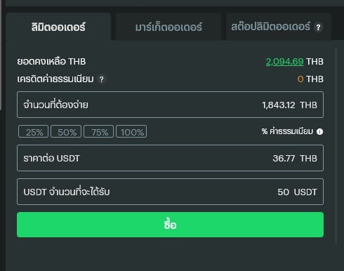 เมื่อเงินบาทของเราพร้อมแล้ว ก็เลือกกดไปที่หน้า “ตลาดซื้อขาย” ของ Bitkub และเลือกค้นหาเหรียญ USDT >>> พิมพ์จำนวน USDT ที่เราต้องการซื้อ (ในที่นี่จะซื้อทั้งสิ้น 50 USDT) >>> จากนั้นกดปุ่มซื้อได้เลย