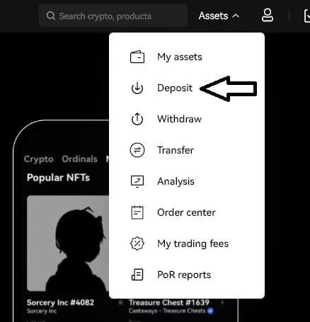 หลังซื้อเหรียญ USDT เรียบร้อย ให้เรา Log-in ไปที่ OKX กดไปที่ “Asset” ด้านบนขวา จากนั้นเลือกคำว่า Deposit (ฝาก)